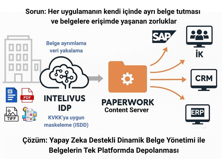 Bu noktada PaperWork; HR, ERP, CRM, IK ve portallar gibi tüm sistemlerle entegre çalışıyor. Tüm belgeleri merkezi bir yapıda birleştiriyor. Ama sadece toplamakla kalmıyor: Belgeleri otomatik olarak sınıflandırıyor (Intelivus), kişisel verileri gizliyor (ISDD), içerikleri güvenli ve versiyonlu olarak saklıyor, gerektiğinde ise size sadece ihtiyacınız olanı gösteriyor ve bunu yapay zeka destekli çözümlerle, insan müdahalesine gerek kalmadan yapıyor.