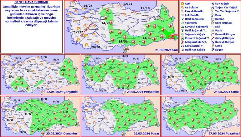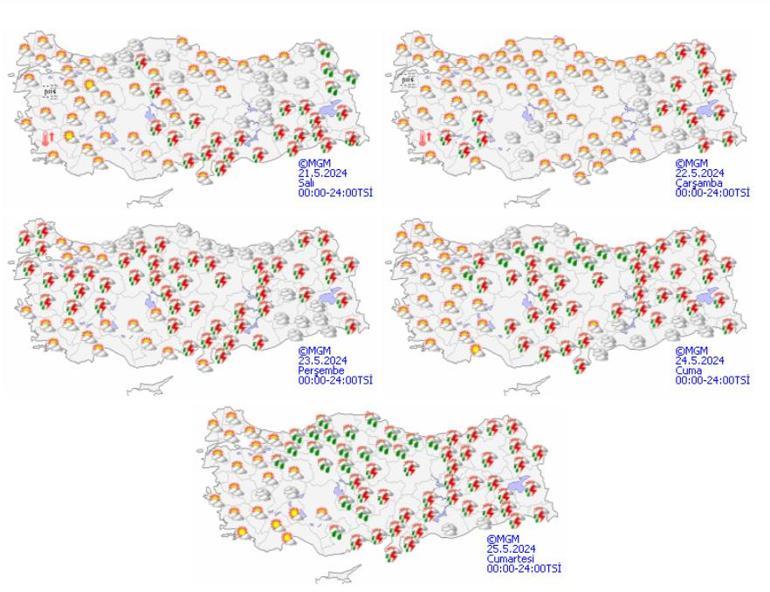Meteoroloji Genel Müdürlüğünden alınan tahminlere göre, ülkemiz genelinin parçalı ve az bulutlu, yer yer çok bulutlu, Doğu Anadolu’nun doğusu, Güney Doğu Anadolu (Diyarbakır haric) ile Ankara’nın kuzey ve doğusu, Adana ve Osmaniye’nin kuzeyi, Kahramanmaraş, Kırıkkale, Çankırı, Yozgat, Çorum, Kayseri, Nevşehir, Niğde, Kırşehir ve Karabük çevrelerinin yerel sağanak ve gök gürültülü sağanak yağışlı geçeceği tahmin ediliyor. Yağışların Hakkari, Van’ın güney ve doğusu, Şırnak’ın doğusu ile Muş ve Bitlis illerinin kuzey ve doğu kesimlerinde yerel olarak kuvvetli olması bekleniyor. Marmara’nın güneyi, Ege ve Batı Akdeniz’de toz taşınımı bekleniyor.